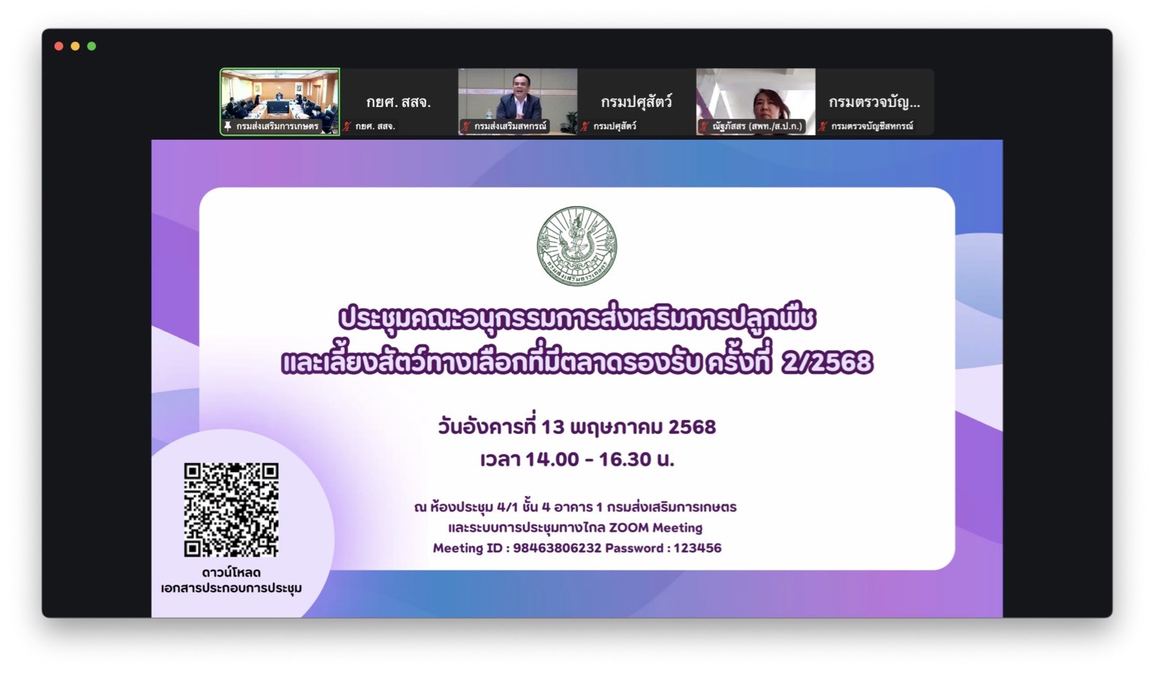 _____วันที่ 13 พฤษภาคม 2568 นายวุฒิชัย ชิณวงศ์ ผู้อำนวยการสำนักส่งเสริมและจัดการสินค้าเกษตร ในฐานะผู้แทนรองอธิบดีกรมส่งเสริมการเกษตร อนุกรรมการและเลขานุการร่วม พร้อมด้วย เจ้าหน้าที่สำนักส่งเสริมและจัดการสินค้าเกษตร เข้าร่วมประชุมคณะอนุกรรมการส่งเสริมการปลูกพืชและเลี้ยงสัตว์ทางเลือกที่มีตลาดรองรับ ครั้งที่ 2/2568 ณ ห้องประชุม 4/1 อาคาร 1 ชั้น 4 กรมส่งเสริมการเกษตร และระบบ Zoom Meeting