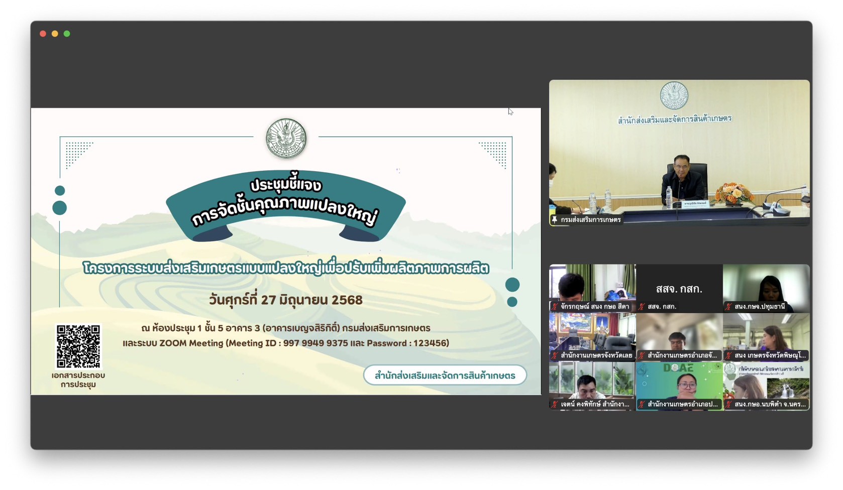 วันที่ 27 มิถุนายน 2568 กลุ่มยุทธศาสตร์และสารสนเทศ สำนักส่งเสริมและจัดการสินค้าเกษตร ได้จัดประชุมชี้แจงการจัดชั้นคุณภาพแปลงใหญ่ โครงการระบบส่งเสริมเกษตรแบบแปลงใหญ่เพื่อปรับเพิ่มผลิตภาพการผลิต โดยมีนายวุฒิชัย ชิณวงศ์ ผู้อำนวยการสำนักส่งเสริมและจัดการสินค้าเกษตร เป็นประธานการประชุม ณ ห้องประชุม 1 ชั้น 5 อาคาร 3 (ส่งเสริมการเกษตรเบญจสิริกิติ์) สำนักส่งเสริมและจัดการสินค้าเกษตร กรมส่งเสริมการเกษตร และผ่านระบบออนไลน์ ZOOM Meeting