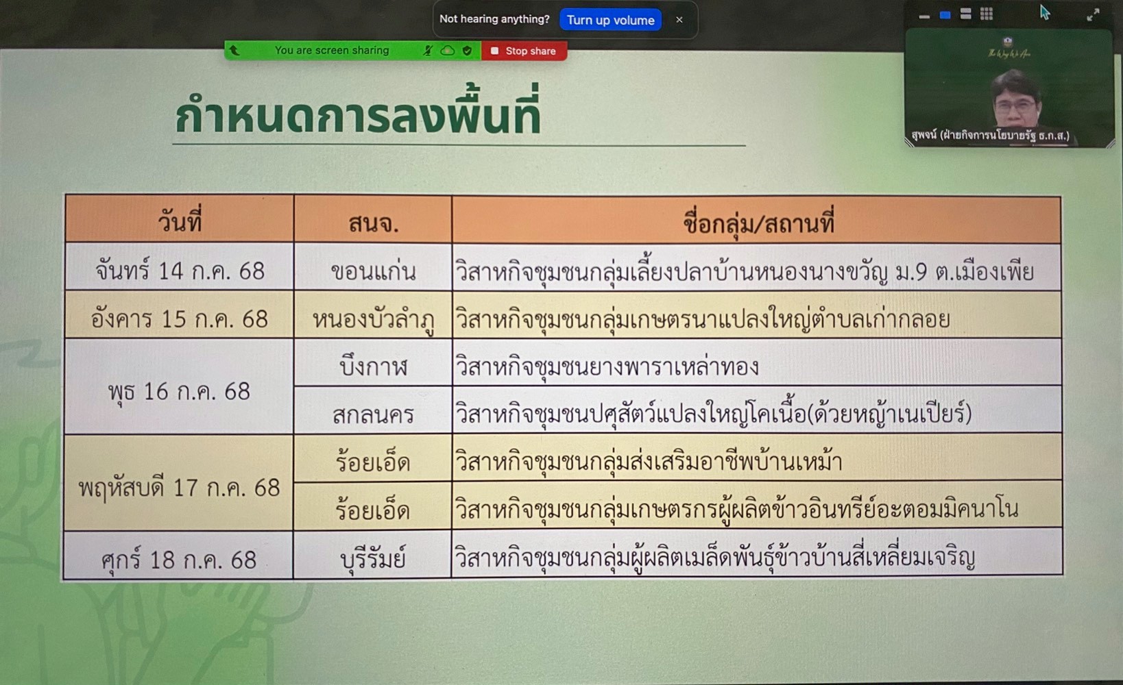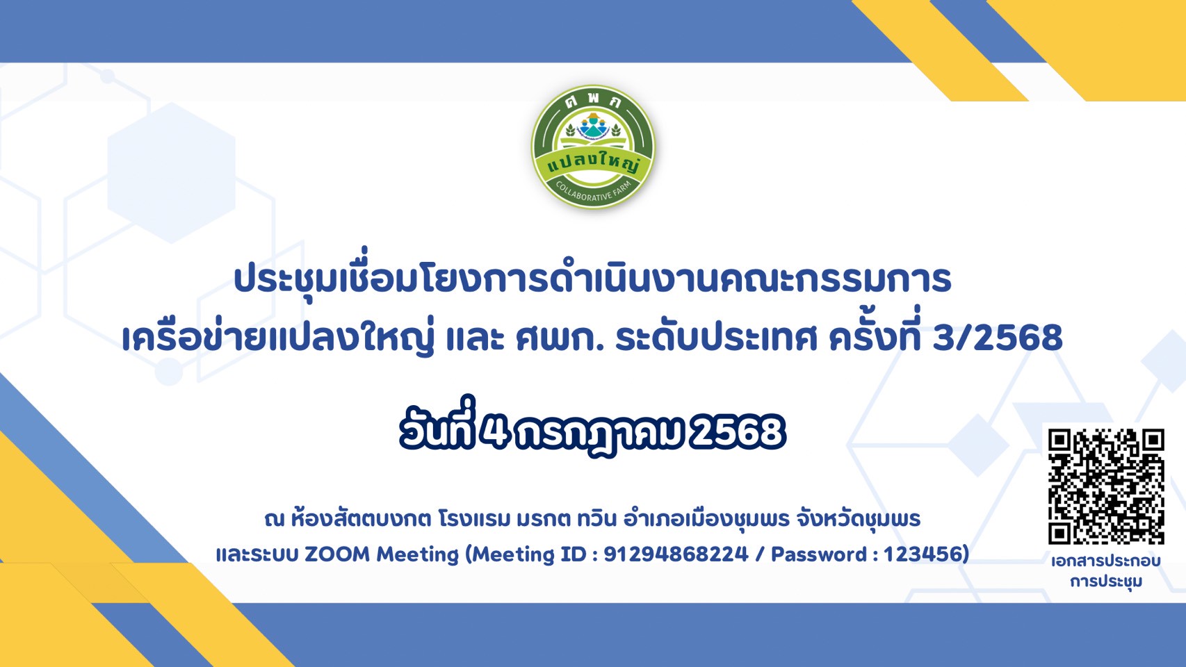 ดำเนินการประชุมเชื่อมโยงการดำเนินงานคณะกรรมการเครือข่ายแปลงใหญ่และ ศพก. ระดับประเทศ ครั้งที่ 3/2568 ณ ห้องประชุมสัตตบงกช จังหวัดชุมพร โดยมีนายวีรศักดิ์ บุญเชิญ รองอธิบดีกรมส่งเสริมการเกษตร เปิดการประชุม และนายสุบรรณ์ รักษ์ทอง เกษตรจังหวัดชุมพรกล่าวต้อนรับ โดยการประชุมในครั้งนี้ มีผู้แทนหน่วยงานภาคีในกระทรวงเกษตรและสหกรณ์ รวมทั้งผู้แทน ธ.ก.ส. ผ่านระบบออนไลน์
