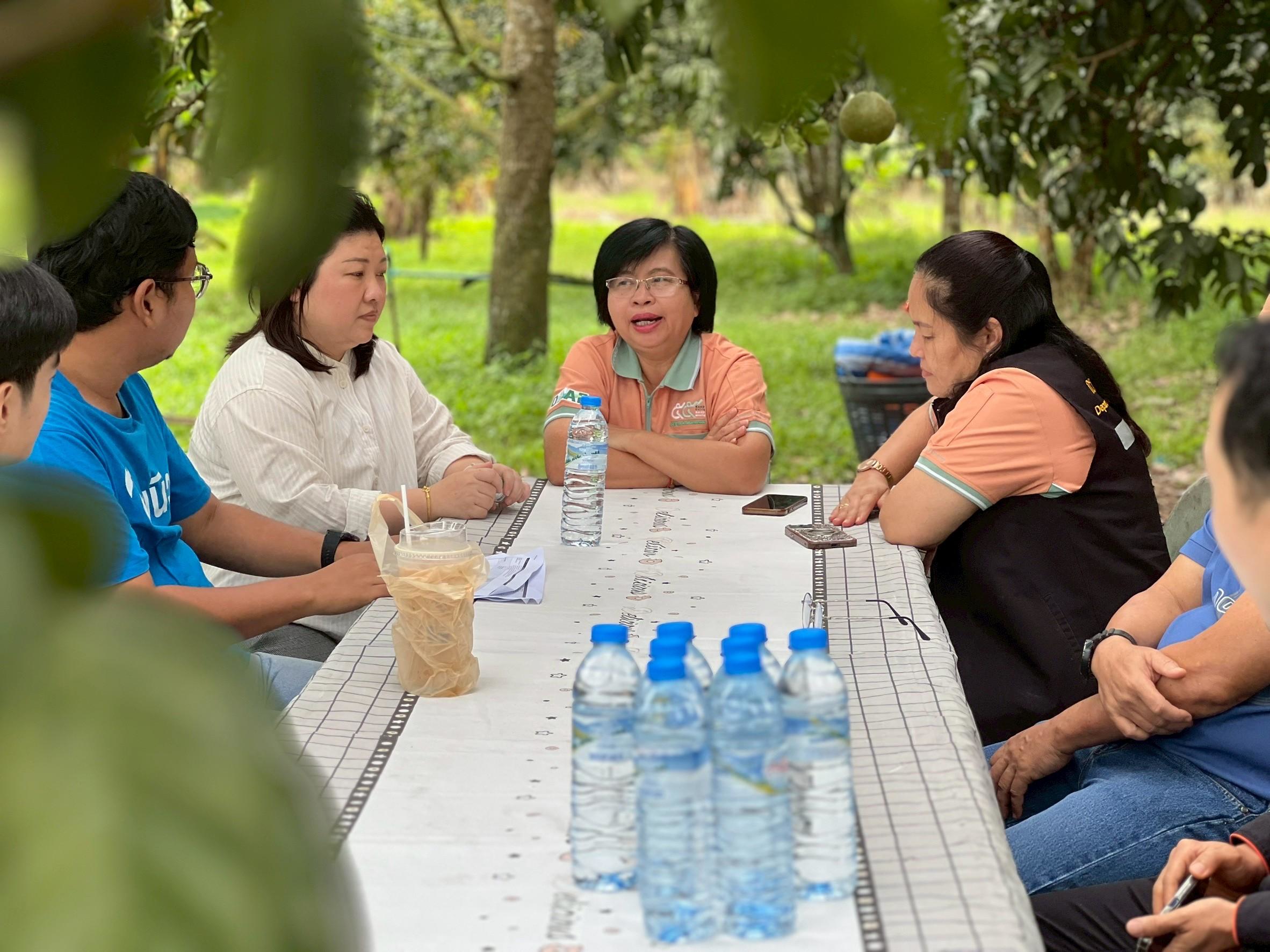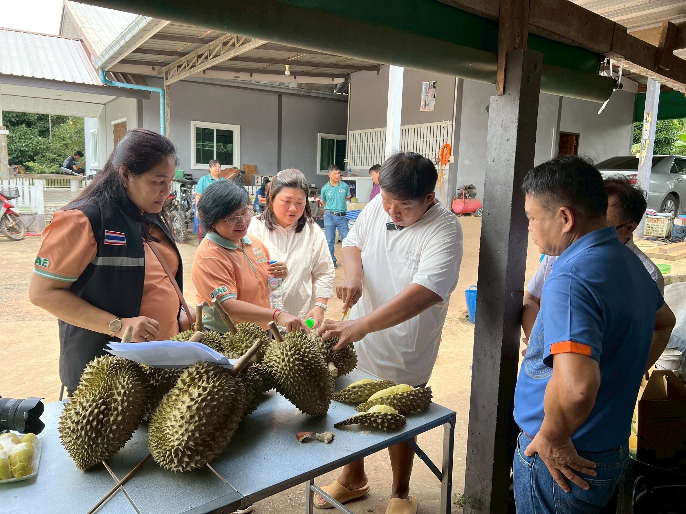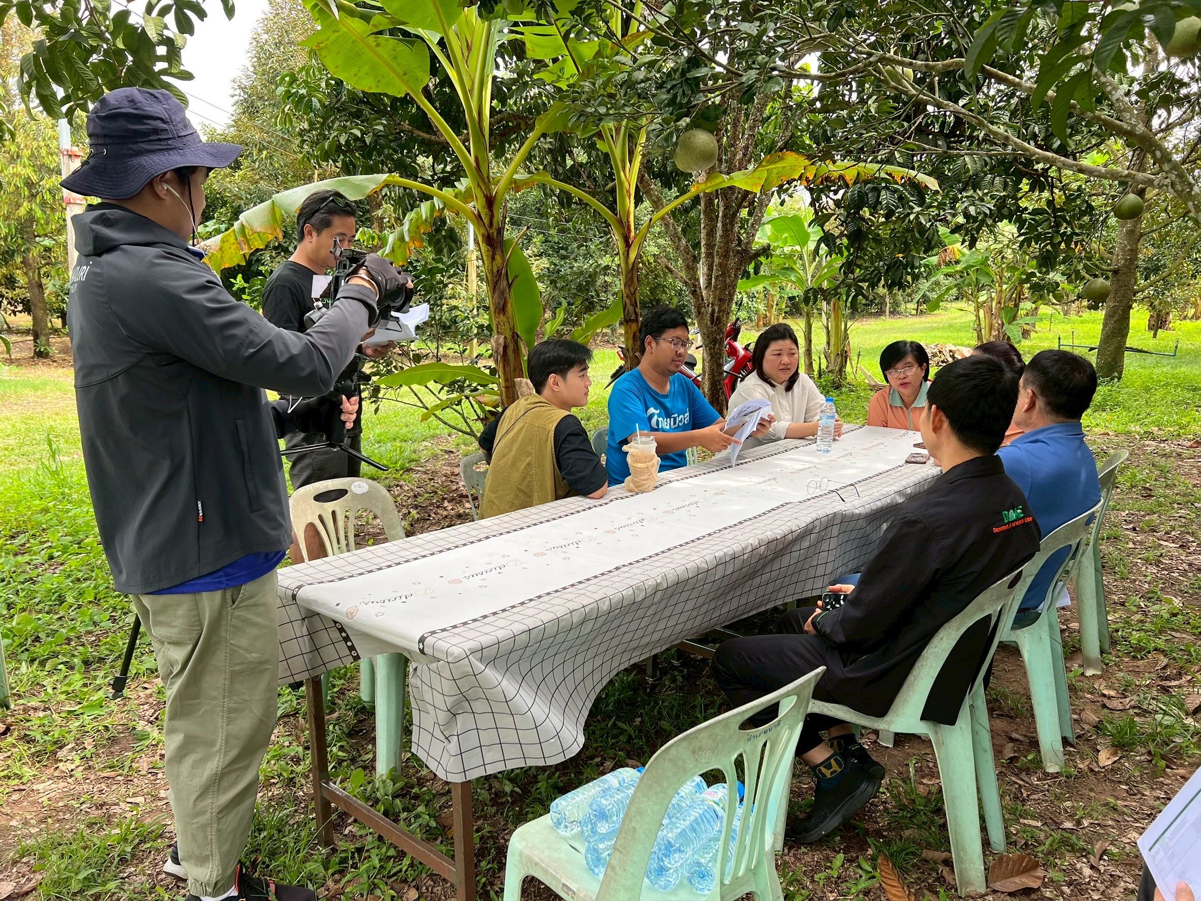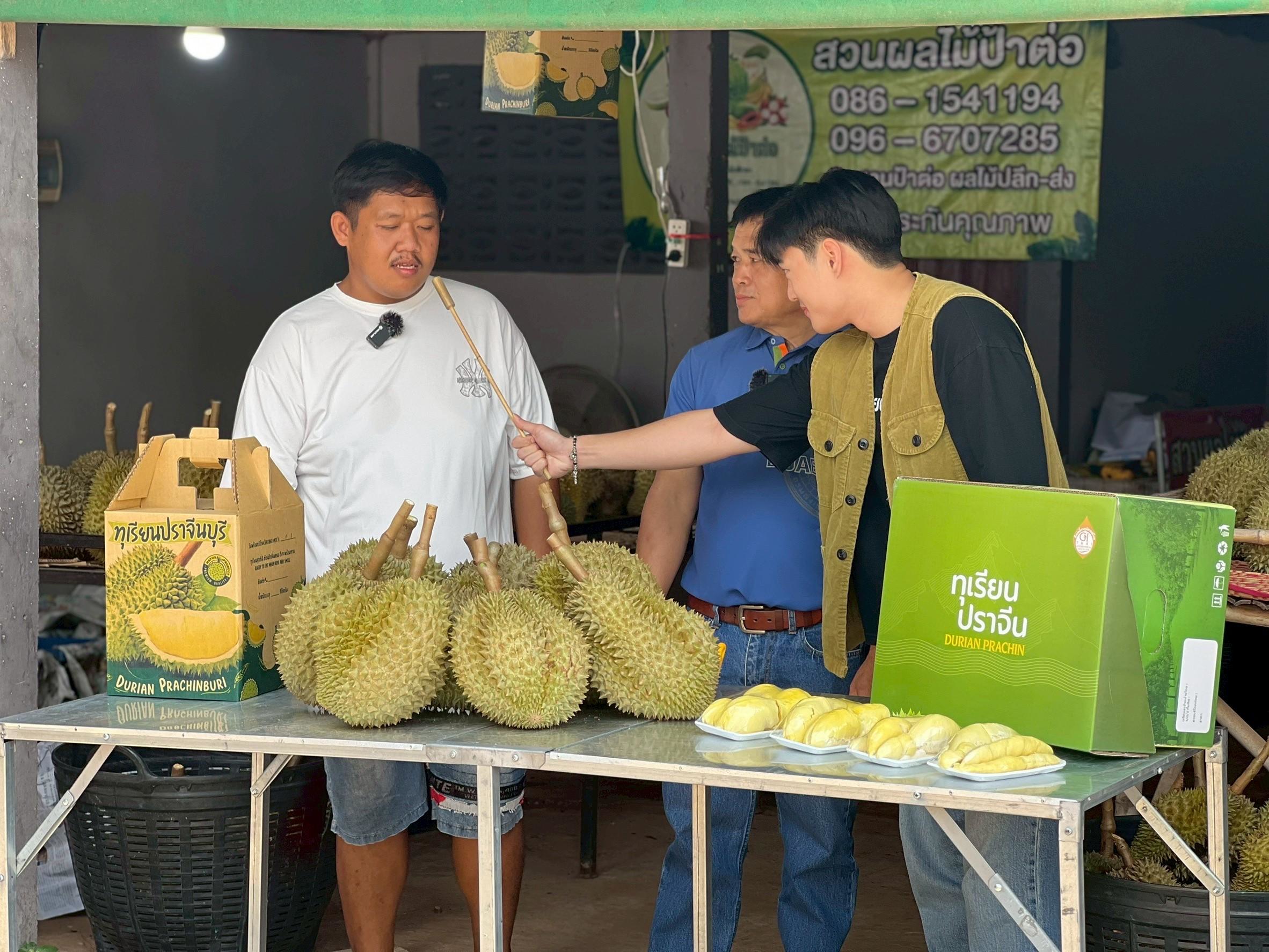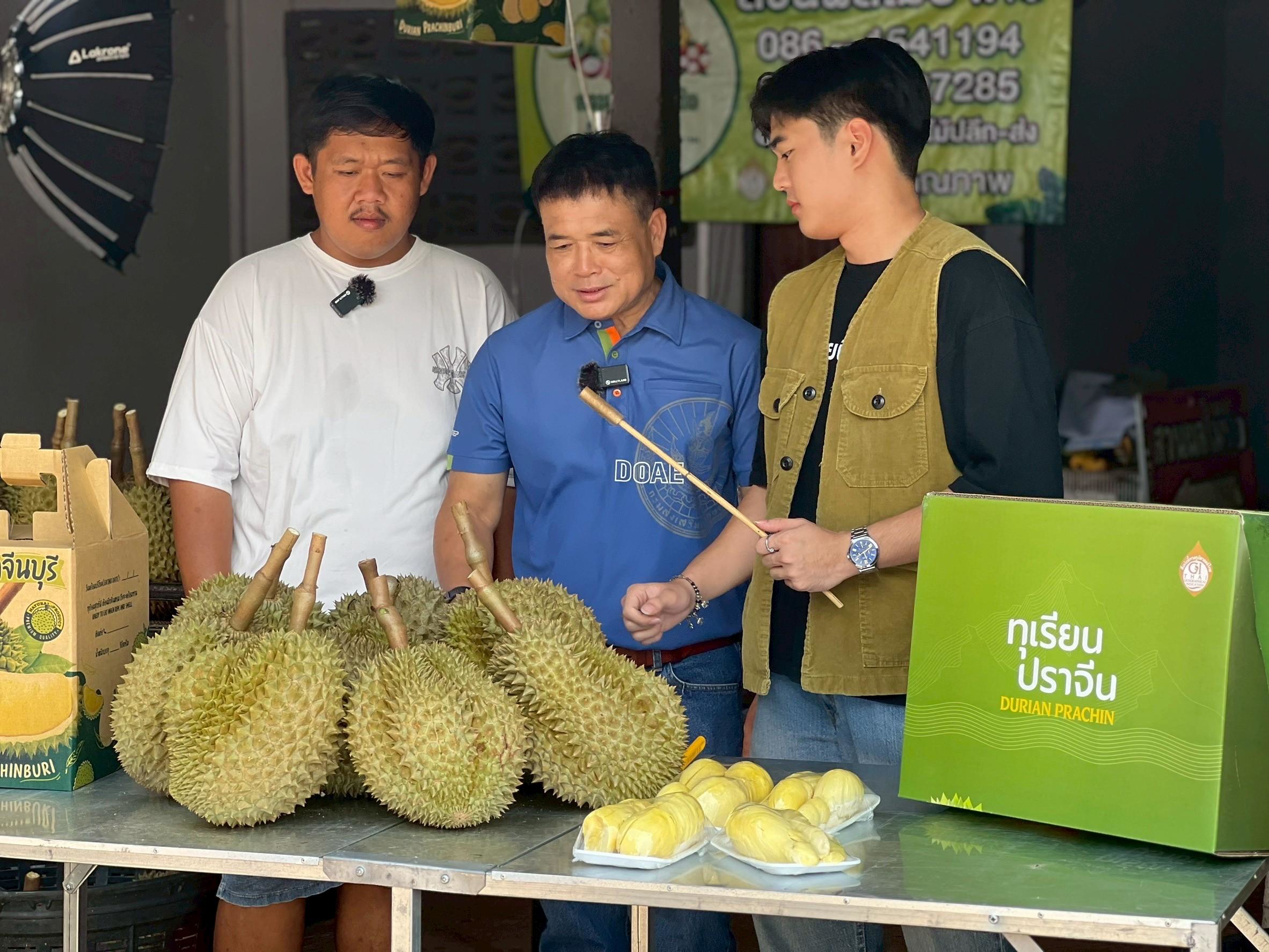 วันที่ 6 กรกฎาคม 2568 นางสาวทัศนา คิดสร้าง ผู้อำนวยการกลุ่มส่งเสริมไม้ผล และเจ้าหน้าที่กลุ่มส่งเสริมไม้ผล สำนักส่งเสริมและจัดการสินค้าเกษตร พร้อมด้วยเจ้าหน้าที่สำนักงานส่งเสริมและพัฒนาการเกษตรที่ 3 จังหวัดระยอง สำนักงานเกษตรจังหวัดปราจีนบุรี และสำนักงานเกษตรอำเภอนาดี ร่วมลงพื้นที่ถ่ายทำวีดิทัศน์ประชาสัมพันธ์ผลไม้อัตลักษณ์ “ทุเรียนปราจีนบุรี” ทุเรียน GI ภายใต้โครงการประชาสัมพันธ์สินค้าเด่นไม้ผลอัตลักษณ์ ปี 2568 ณ สวนป้าต่อ หมู่ 11 ตำบลแก่งดินสอ อำเภอนาดี จังหวัดปราจีนบุรี ในการนี้ได้รับเกียรติจากนางอุบล มากอง ผู้อำนวยการสำนักงานส่งเสริมและพัฒนาการเกษตรที่ 3 จังหวัดระยอง นายอรุณ เหมือนตา เกษตรจังหวัดปราจีนบุรี และนายอานนท์ น้อยห่วง เกษตรกรเจ้าของสวนผลไม้ป้าต่อ ร่วมถ่ายทำวิดีทัศน์ในครั้งนี้ ซึ่งได้ประชาสัมพันธ์ถึงจุดเด่นหรืออัตลักษณ์ของทุเรียนปราจีนบุรี ทุเรียน GI ที่มีความเป็นอัตลักษณ์ตามลักษณะภูมิประเทศ และภูมิอากาศที่แตกต่างจากพื้นที่อื่น ส่งผลต่อคุณลักษณะที่มีความเฉพาะตัวของทุเรียนปราจีนบุรี