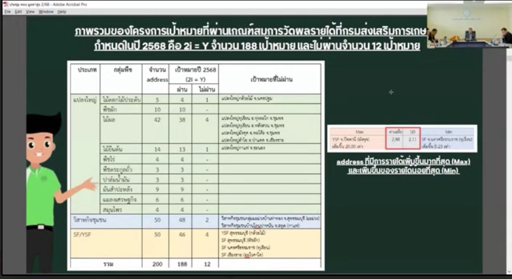 วันที่ 17 กันยายน 2568 นายพีรพันธ์ คอทอง อธิบดีกรมส่งเสริมการเกษตร เป็นประธาน นายวีรศักดิ์ บุญเชิญ รองอธิบดีกรมส่งเสริมการเกษตร นายวุฒิชัย ชิณวงศ์ ผู้อำนวยการสำนักส่งเสริมและจัดการสินค้าเกษตร นางสาวเพ็ญระพี ทองอินทร์ ผู้เชี่ยวชาญด้านส่งเสริมและจัดการการผลิตไม้ผล ไม้ยืนต้น และยางพารา และผู้อำนวยการกลุ่มกองสำนักในโครงการฯ รายงานผลการดำเนินงานโครงการฯ ปี 2568 มีการเก็บข้อมูลรายได้จาก (1) กลุ่มแปลงใหญ่ รวม 100 แปลง (2) วิสาหกิจชุมชน รวม 50 แห่ง (3) Smart Farmer (SF) และ/หรือ Young Smart Famer (YSF) รวม 50 ราย รวมทั้งสิ้น 200 แปลง/วิสาหกิจชุมชน/ราย ว่ามีการผ่านเกณฑ์ตามที่กำหนดเท่าไรและไม่ผ่านเท่าไร พร้อมทั้งอธิบายถึงปัญหาและอุปสรรคต่างๆในการดำเนินงาน และหาวิธีการที่จะทำให้มีรายได้เพิ่มขึ้นจากเดิม พร่อมทั้งมีการบูรณาการงานร่วมกันเพื่อให้บรรลุเป้าหมายในปีถัดไป