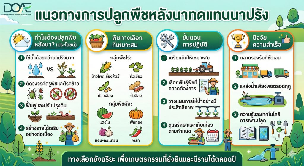 พี่น้องคนไหนเบื่อปัญหาทำนาปรังแล้วไม่ได้กำไร หรือต้องคอยลุ้นเรื่องน้ำทุกปี… ลองเปลี่ยนมาปลูกข้าวโพด ถั่วเขียว หรือพืชผักดูไหมคะ?